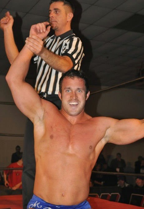 I wasn't able to identify Chris "The Shark" Andrews' opponent in this recent post, but thanks to several blog readers, I now know who the camouflage-wearing beefcake in those photos is. He goes by the name Paul Ryker aka The Commando. Ryker is from Victoria, British Colombia, but now wrestles in the UK. Before turning pro, Ryker was in The British Army and served in Iraq. Watch out for more pics of The Commando coming very soon!