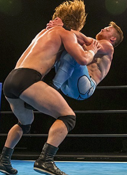 Twin Powers! Here are American independent wrestlers and identical twin brothers Logan and Sterling Riegel. Watch these twin brothers face another set of twin brothers here: The Riegel Twins vs The Vorus Twins.